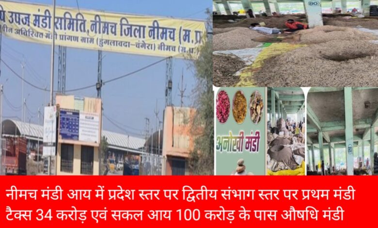 कृषि उपज मंडी समिति नीमच, प्रदेश स्तर पर द्वितीय एवं संभाग स्तर पर प्रथम स्थान पर मंडी टैक्स 34 करोड़ एवं सकल आय 100 करोड़ के पार