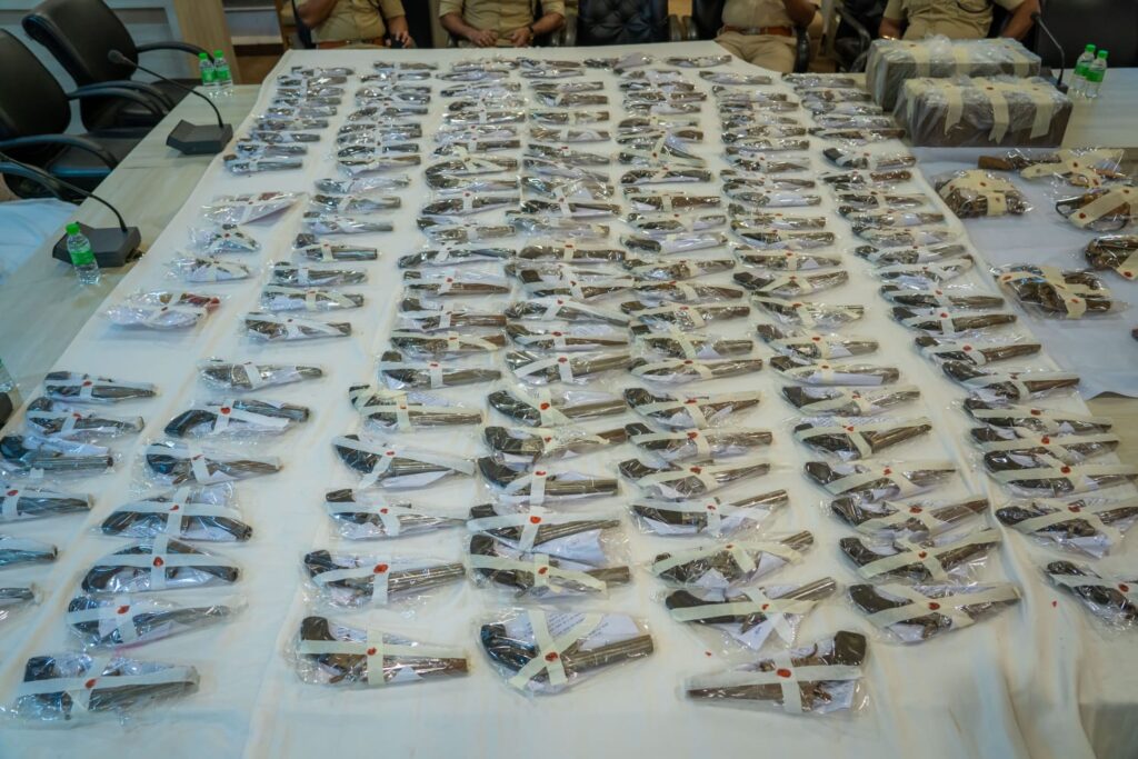 कुल 151 नग देसी कट्टे एवं, 13 जिंदा कारतूस अवैध हथियार बनाने की फैक्ट्री में उपयोग किए जाने वाले उपकरण कुल मश्रुका कीमती 31 लाख 56 हजार 500/- रुपये” का जप्त