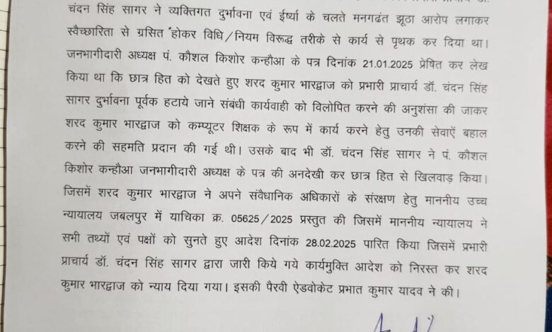जनभागीदारी अध्यक्ष पं. कौशल किशोर कन्हौआ के पत्र दिनांक 21.01.2025 प्रेषित कर लेख किया था कि छात्र हित को देखते हुए शरद कुमार भारद्वाज को प्रभारी प्राचार्य डॉ. चंदन सिंह सागर दुर्भावना पूर्वक हटाये जाने संबंधी कार्यवाही को विलोपित करने की अनुशंसा की जाकर शरद कुमार भारद्वाज को कम्प्यूटर शिक्षक के रूप में कार्य करने हेतु उनकी सेवाएँ बहाल करने की सहमति प्रदान की गई थी।