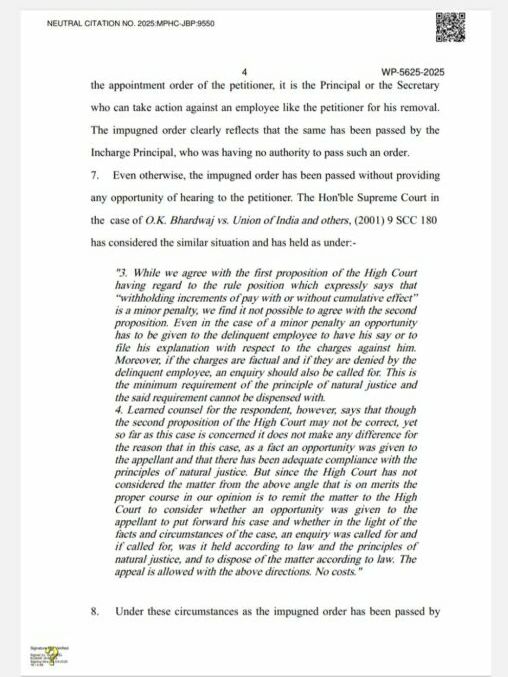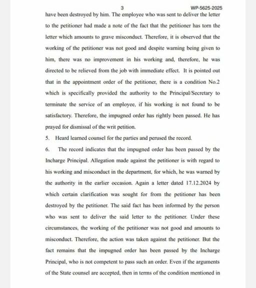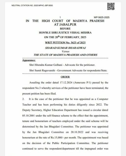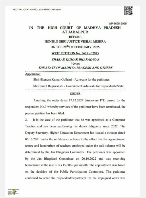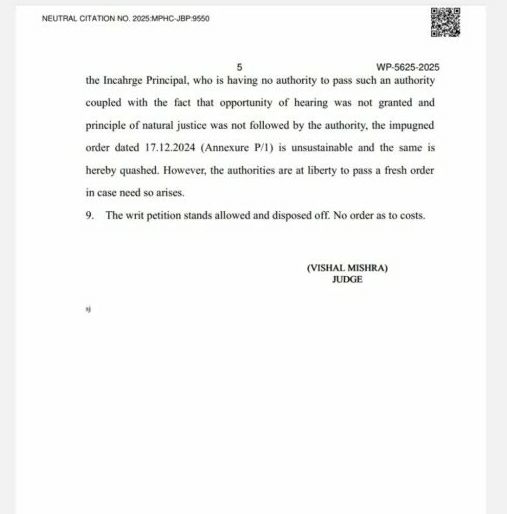 जिसमें शरद कुमार भारद्वाज ने अपने संवैधानिक अधिकारों के संरक्षण हेतु माननीय उच्च न्यायालय जबलपुर में याचिका क्र. 05625/2025 प्रस्तुत की जिसमें माननीय न्यायालय ने सभी तथ्यों एवं पक्षों को सुनते हुए आदेश दिनांक 28.02.2025 पारित किया जिसमें प्रभारी प्राचार्य डॉ. चंदन सिंह सागर द्वारा जारी किये गये कार्यमुक्ति आदेश को निरस्त कर शरद कुमार भारद्वाज को न्याय दिया गया। इसकी पैरवी ऐडवोकेट प्रभात कुमार यादव ने की।