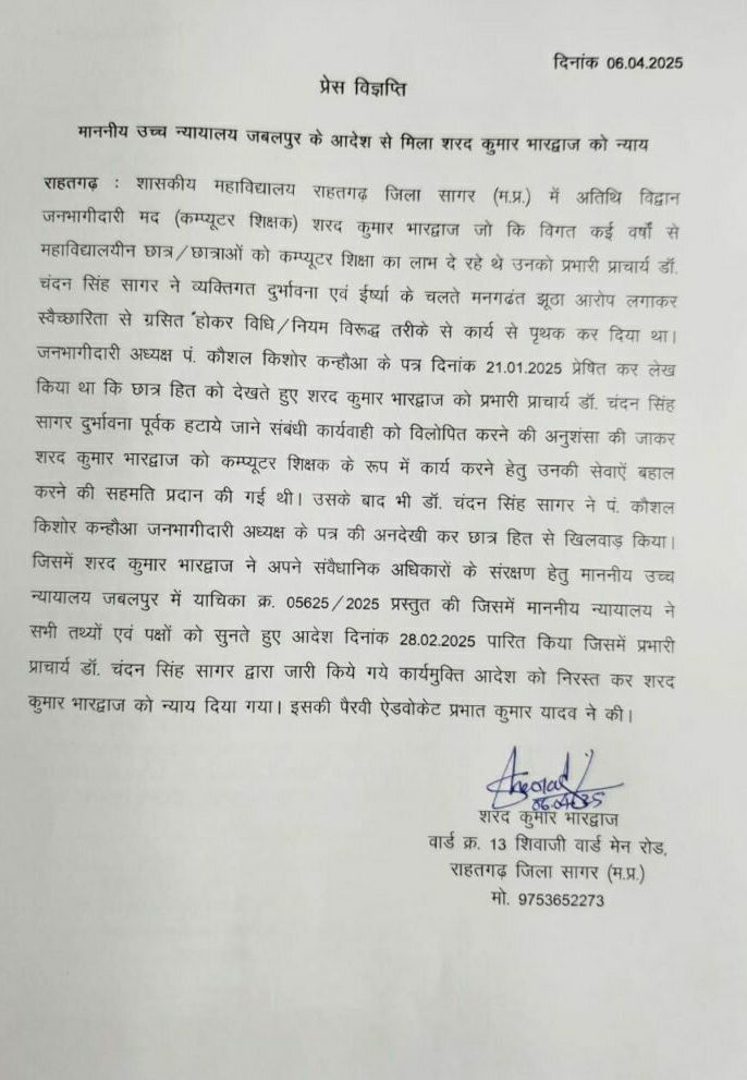 अतिथि विद्वान को मा.उच्च न्यायालय जबलपुर के आदेश से मिला शरद कुमार भारद्वाज को न्याय, प्रभारी प्राचार्य डॉ. चंदन सिंह सागर द्वारा जारी किये गये कार्यमुक्ति आदेश को निरस्त कर शरद कुमार भारद्वाज को न्याय दिया गया