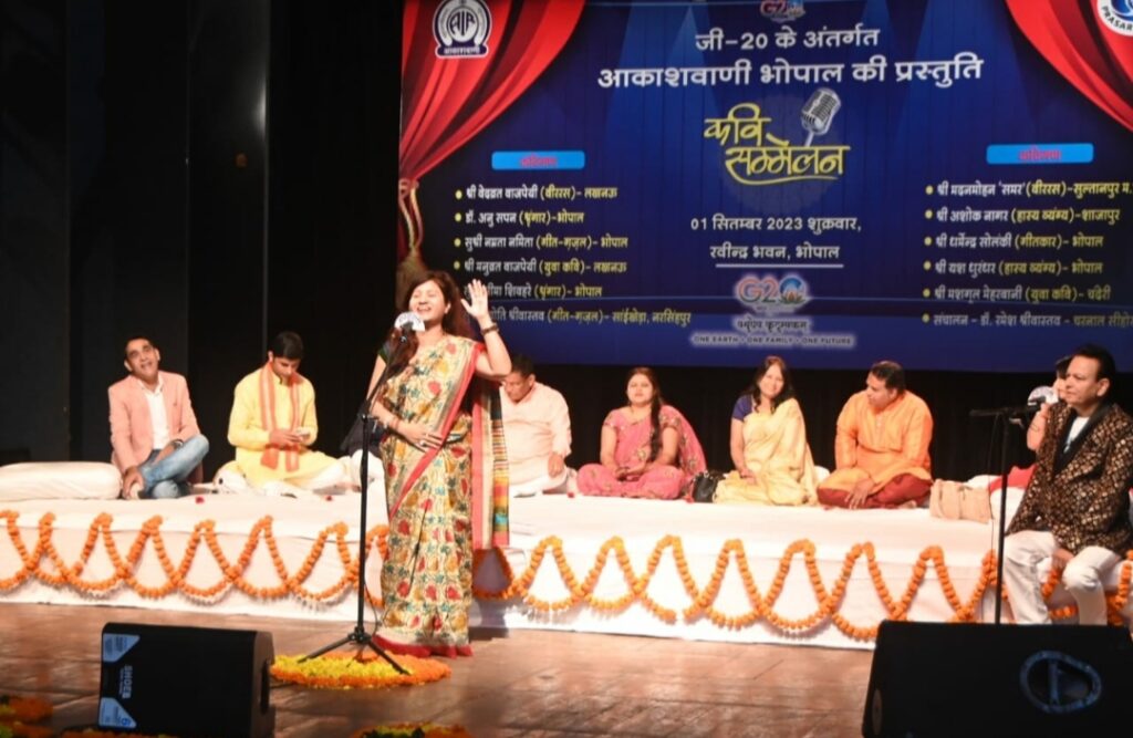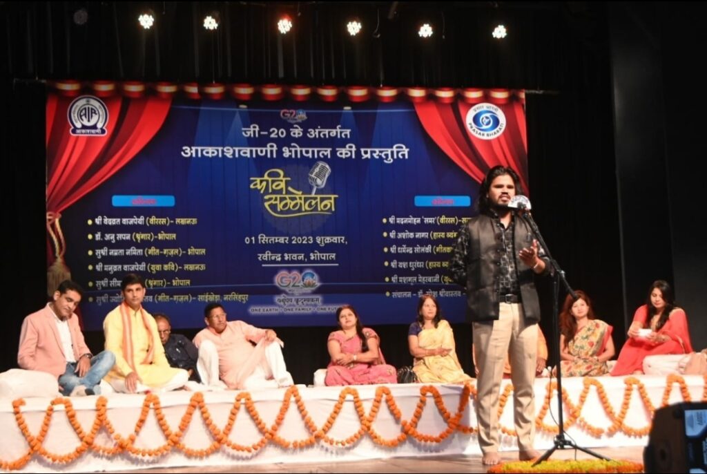 आकाशवाणी भोपाल ने g20 की भारत की अध्यक्षता के उत्सव को मनाने की श्रृंखला में शब्दों का अनोखा संसार रचने वाले कवि सम्मेलन का आयोजन किया जिसमें भोपाल और बाहर के भी अथिति कवियों ने अपनी रचनाओं से उपस्थित जन समुदाय का मनोरंजन किया इस कवि सम्मेलन में जहां युवा कभी भी शामिल थे वहीं देश के मध्य प्रतिष्ठित वीर रस के कवि वेदव्रत वाजपेई जैसे और मदन मोहन समर्थ और देश-विदेश में भोपाल करो हम रोशन करने वाली गीतकार डॉ अनुशासन भी शामिल थे जैसे वरिष्ठ वीर रस के ओजस्वी कवि भी थे। भोपाल की कवियित्री सीमा शिवहरे ने श्रांगार रस बिखेरते हुए कहा