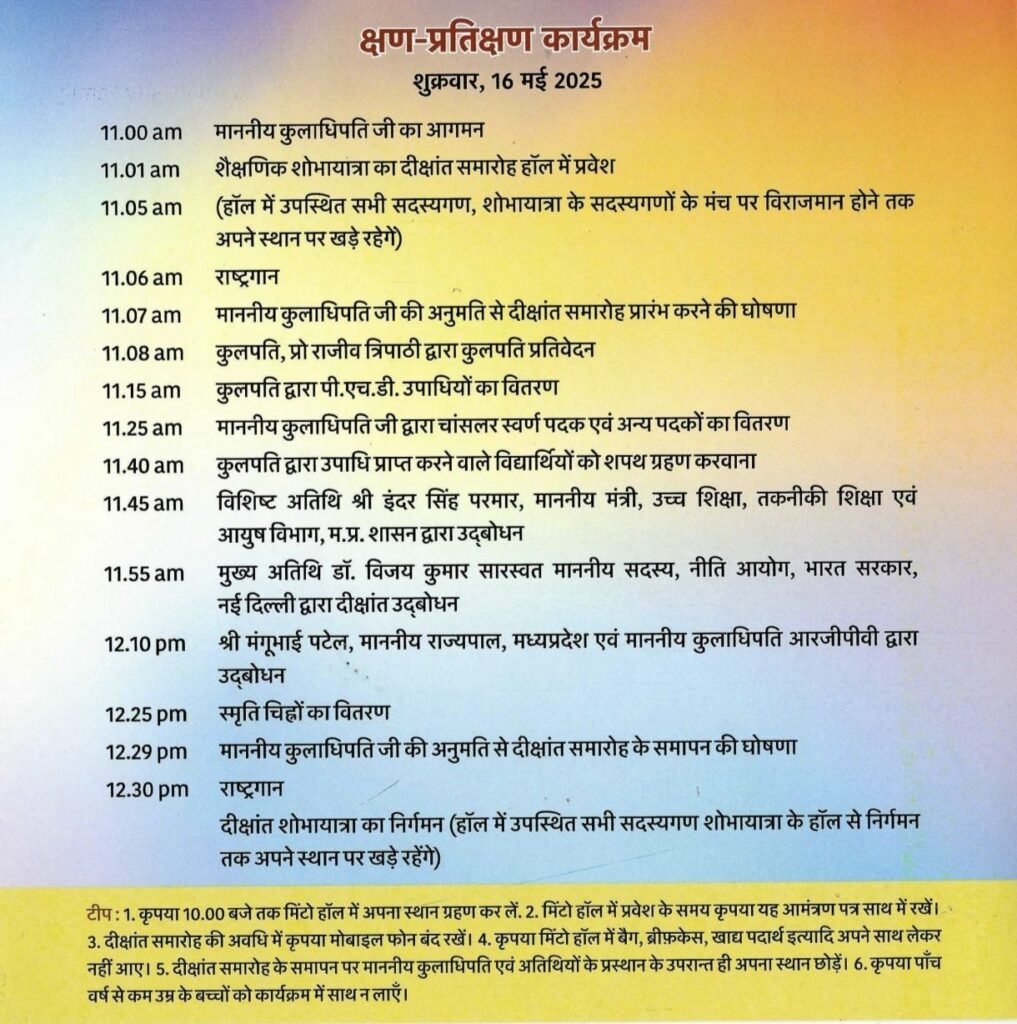 इस अवसर पर समारोह की अध्यक्षता मध्यप्रदेश के राज्यपाल एवं कुलाधिपति श्री मंगुभाई पटेल करेंगे, मुख्य अतिथि के रूप में डिक्शन उद्बोधन नीति आयोग भारत सरकार के सदस्य डॉ विजय कुमार सारस्वत देंगे।दीक्षांत समारोह केक विशिष्ट अतिथि उच्च शिक्षा तकनीकी शिक्षा एवं आयुष विभाग मध्यप्रदेश शासन के मंत्री श्री इंदर सिंह परमार होंगे, इस अवसर पर दीक्षांत प्रतिवेदन विश्वविद्यालय के कुलपति प्रो राजीव त्रिपाठी प्रस्तुत करेंगे।