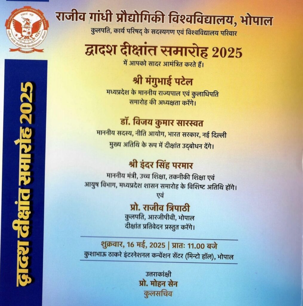 भोपाल-राजीव गाँधी प्रौद्योगिकी विश्वविद्यालय भोपाल का बारहवाँ दीक्षांत समारोह 16 मई को प्रातः 11 बजे कुशाभाऊ ठाकरे इंटरनेशनल कन्वेंशन सेंटर (मिंटो हॉल) भोपाल में सम्पन्न होगा।