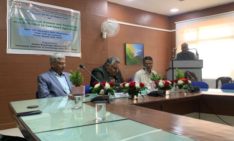 भारतीय ज्ञान परंपरा प्रकोष्ठ यूआईटी आरजीपीवी द्वारा “गाय आधारित कृषि के सन्दर्भ में प्राचीन भारतीय विज्ञान और प्रौद्योगिकी” विषय पर विश्वविद्यालय के सीनेट हाल में व्याख्यान कार्यक्रम आयोजित किया गया. कार्यक्रम के मुख्य अतिथि मेनिट भोपाल के निदेशक, डॉ. करुणेश कुमार शुक्ला, मुख्य वक्ता मोटीवेशनल स्पीकर एवं ख्यात सामाजिक कार्यकर्ता श्री केइएन राघवन (चेन्नई) थे.