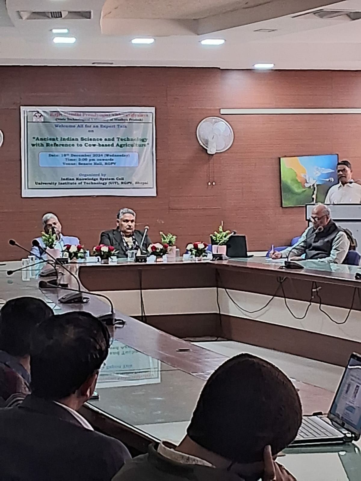 भारतीय ज्ञान परंपरा प्रकोष्ठ यूआईटी आरजीपीवी द्वारा “गाय आधारित कृषि के सन्दर्भ में प्राचीन भारतीय विज्ञान और प्रौद्योगिकी” विषय पर विश्वविद्यालय के सीनेट हाल में व्याख्यान कार्यक्रम आयोजित किया गया. कार्यक्रम के मुख्य अतिथि मेनिट भोपाल के निदेशक, डॉ. करुणेश कुमार शुक्ला, मुख्य वक्ता मोटीवेशनल स्पीकर एवं ख्यात सामाजिक कार्यकर्ता श्री केइएन राघवन (चेन्नई) थे.