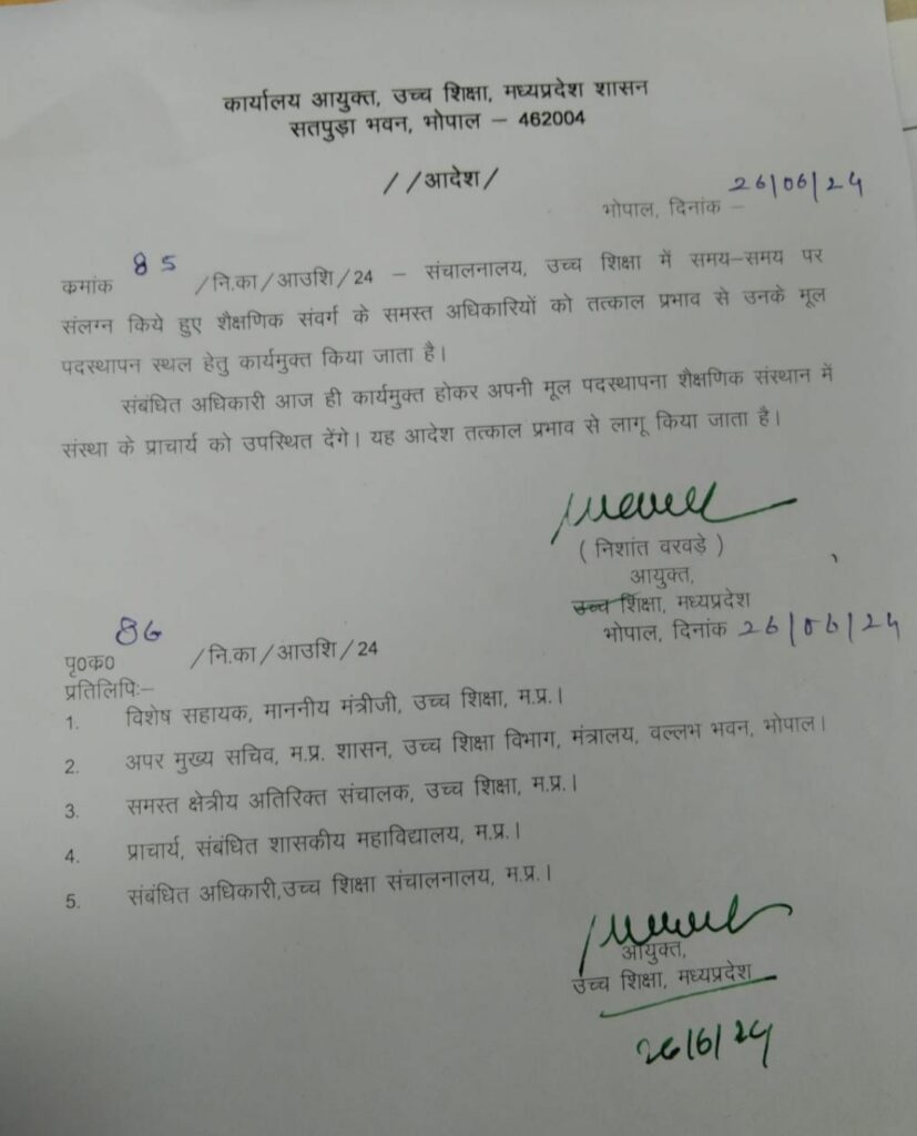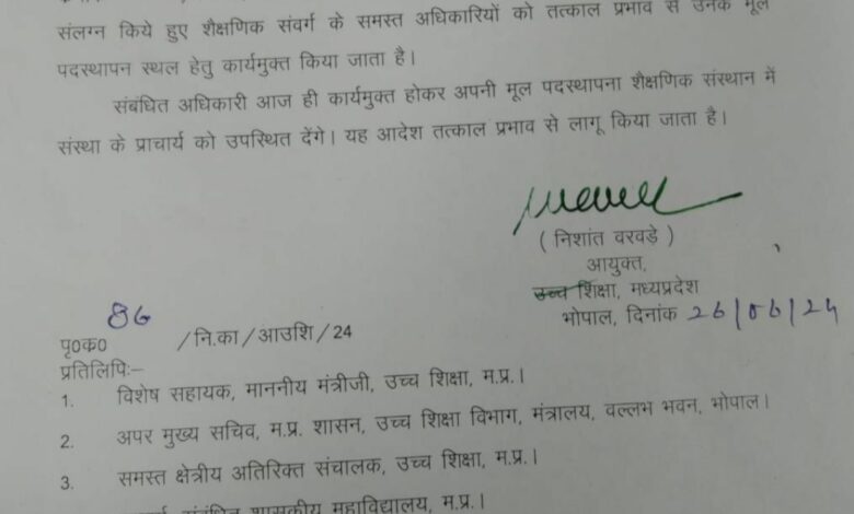 उच्च शिक्षा संचालनालय मे सभी ओएसडी शैक्षणिक संवर्ग के हटाए गए, आयुक्त ने तत्काल अपनी मूल पद स्थापना हेतु कार्य मुक्त किया
