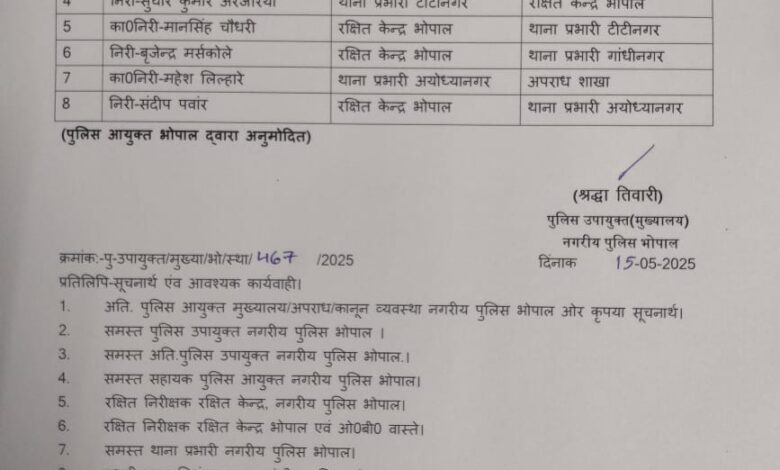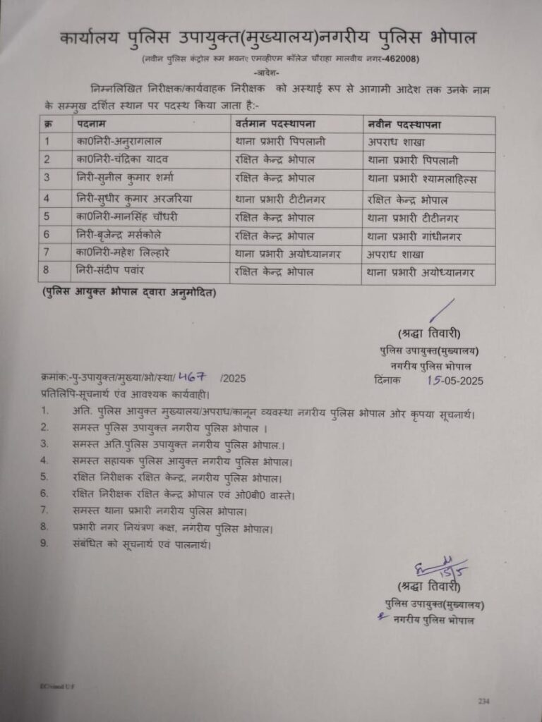 राजधानी भोपाल के कई थाना प्रभारी इधर से उधर हुए टी टी नगर थाना प्रभारी सुधीर अर्जरिया को लाइन भेज गया लाइन से संदीप पवार को अयोध्या नगर थाना प्रभारी बनाया गया