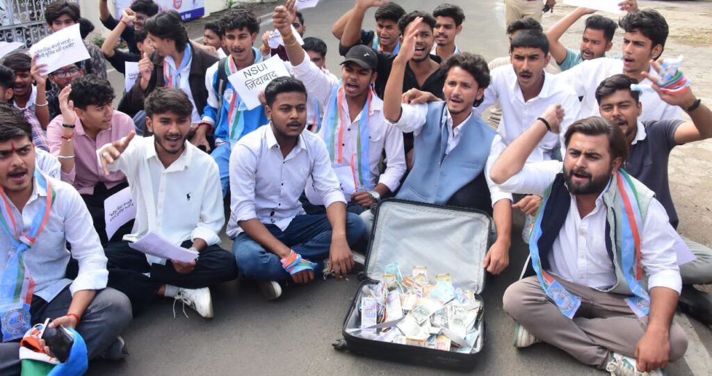 एमपी एसआई भर्ती परीक्षा में चल रहे विवाद को लेकर आज राजधानी भोपाल में कांग्रेस की छात्र इकाई एनएसयूआई ने जोरदार विरोध प्रदर्शन किया। एनएसयूआई कार्यकर्ताओं ने नोटों से भरा बैग लेकर सांकेतिक प्रदर्शन किया, जिससे उन्होंने यह संदेश दिया कि “भ्रष्टाचार से भरी परीक्षा भर्ती परीक्षा प्रक्रिया करवाने वाली परीक्षा एजेंसी कर्मचारी चयन मंडल ब्लेकलिस्टेड निजी कंपनी से सांठ गाँठ कर पैसे लेकर नौकरियाँ बेचने की तैयारी में है “