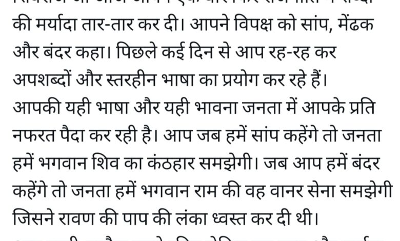 शिवराज जी आज आपने एक बार फिर राजनीति में शब्दों की मर्यादा तार-तार कर दी। आपने विपक्ष को सांप, मेंढक और बंदर कहा। पिछले कई दिन से आप रह-रह कर अपशब्दों और स्तरहीन भाषा का प्रयोग कर रहे हैं।