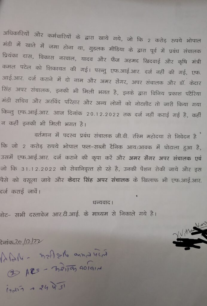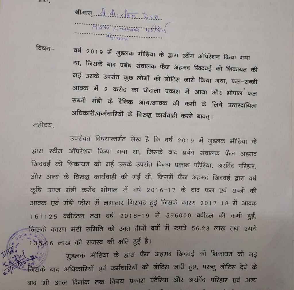 परंतु अब सवाल यहां उठना है कि क्या मंडी बोर्ड में बैठे उच्च अधिकारियों को इसकी खबर नहीं थी वर्ष 2019 में हमारे द्वारा एक स्टिंग ऑपरेशन किया गया था जिसमें विनय प्रकाश पटेरिया जो कि 2019 मैं भोपाल मंडी सचिव थे उनके द्वारा फल सब्जी आवक में दो करोड रुपए का घोटाला किया गया था जिसकी हमारे द्वारा इन्वेस्टिगेशन किया गया था जिसके बाद प्रबंध संचालक फ़ैज़ अहमद किदवई के द्वारा उनके ऊपर 2 करोड रुपए की रिकवरी निकाली गई थी फल सब्जी आवक में जिसकी हमारे द्वारा शिकायत की गई लिखित में परंतु 2019 के बाद जो प्रबंध संचालक मंडी बोर्ड में बने हैं उनके द्वारा आज दिनांक तक कोई कार्रवाई नहीं की गई है चलिए मैं आपको बताता हूं उन प्रबध संचालकों के नाम जो की