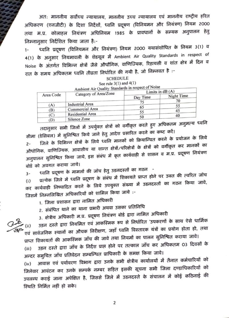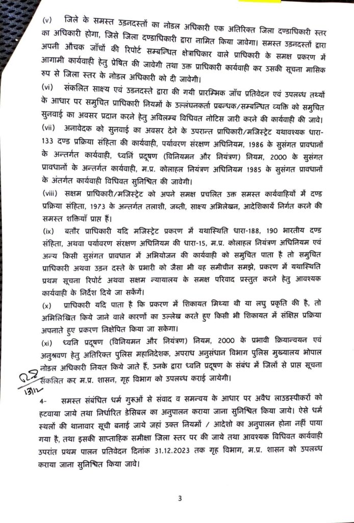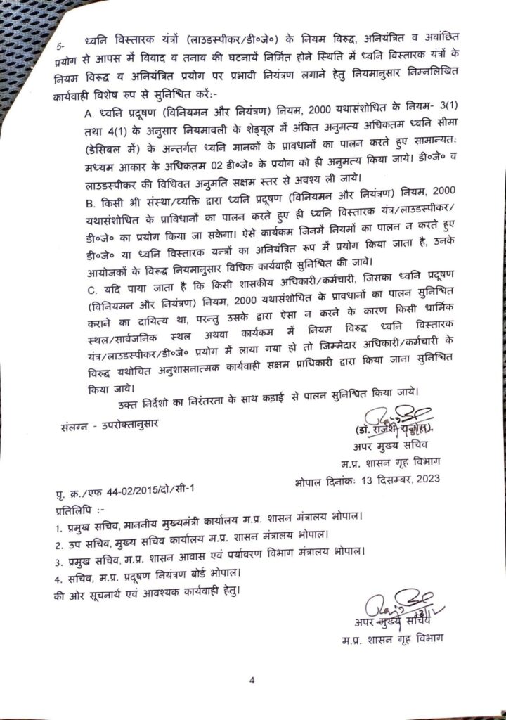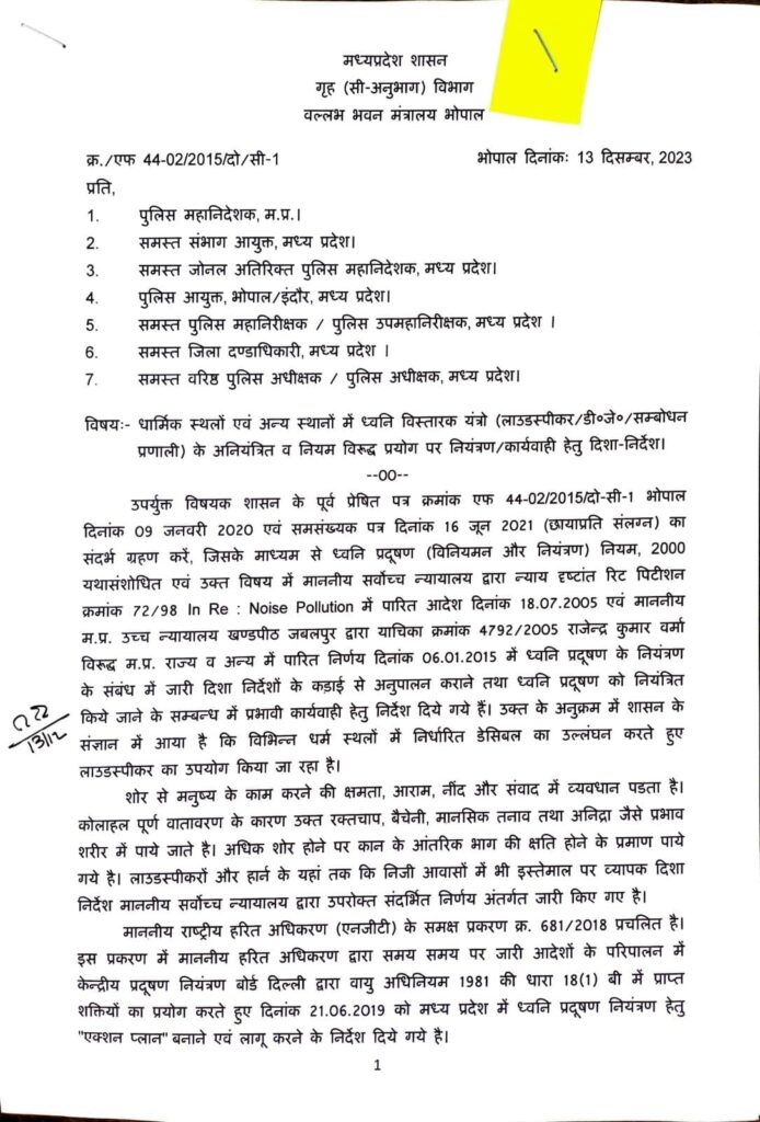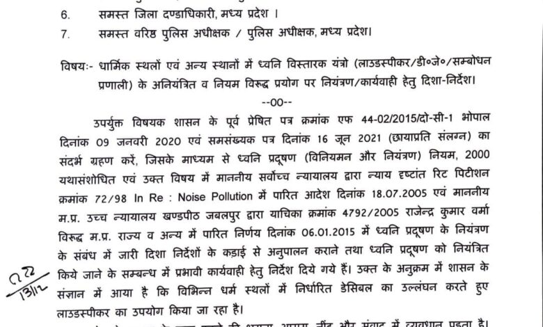 गृह विभाग, मप्र शासन ने धार्मिक स्थलों तथा अन्य स्थलों में अनियमित अथवा अनियंत्रित ध्वनि विस्तारक यंत्रों नियंत्रण