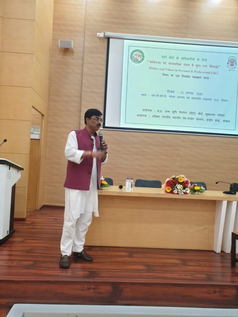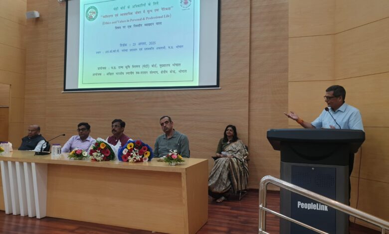 मोरल एथिक्स इन पर्सनल एंड प्रोफेशनल लाइफ विषय पर एक दिवसीय कार्यशाला का आयोजन आर सी वी पी नरोना प्रशासन अकादमी शाहपुरा भोपाल में मध्य प्रदेश राज्य कृषि विपणन बोर्ड द्वारा आयोजित किया गया