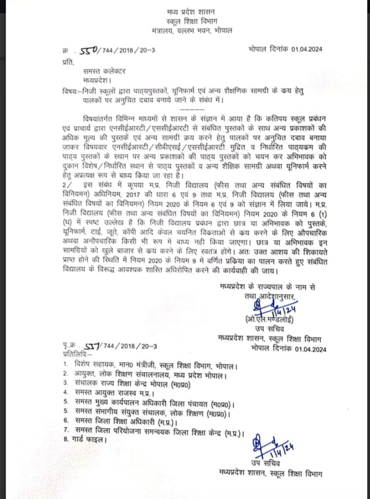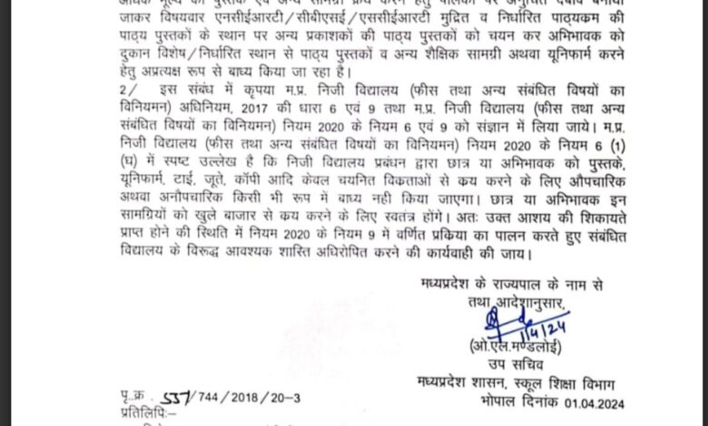 जबलपुर कलेक्टर दीपक सक्सेना ने 19 स्कूल्स के खिलाफ FIR के निर्देश दिए हैं। उन्होंने पेरेंट्स के लिए कहा है कि अगर स्कूल यूनिफॉर्म या फिर कॉपी-किताबें एक ही दुकान से खरीदने का दबाव बनाते हैं तो शिकायत करें। कलेक्टर के निर्देश पर सैंट ऐलाईसिस सीनियर सेकेंडरी स्कूल पोलीपाथर, रेयान इंटरनेशनल स्कूल, केयर पब्लिक स्कूल नेपियर टाउन समेत 19 स्कूल पर कार्रवाई की गई है।