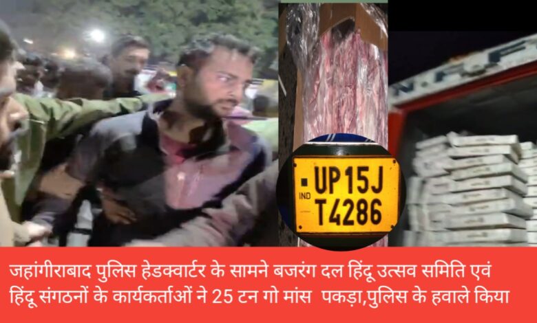 जहांगीराबाद पुलिस हेडक्वार्टर के सामने बजरंग दल हिंदू उत्सव समिति एवं हिंदू संगठनों के कार्यकर्ताओं ने 25 टन गो मांस पकड़ा,पुलिस के हवाले किया