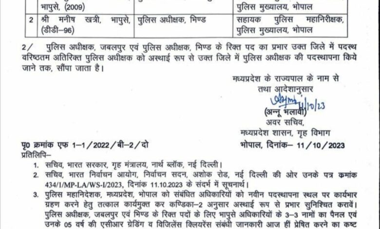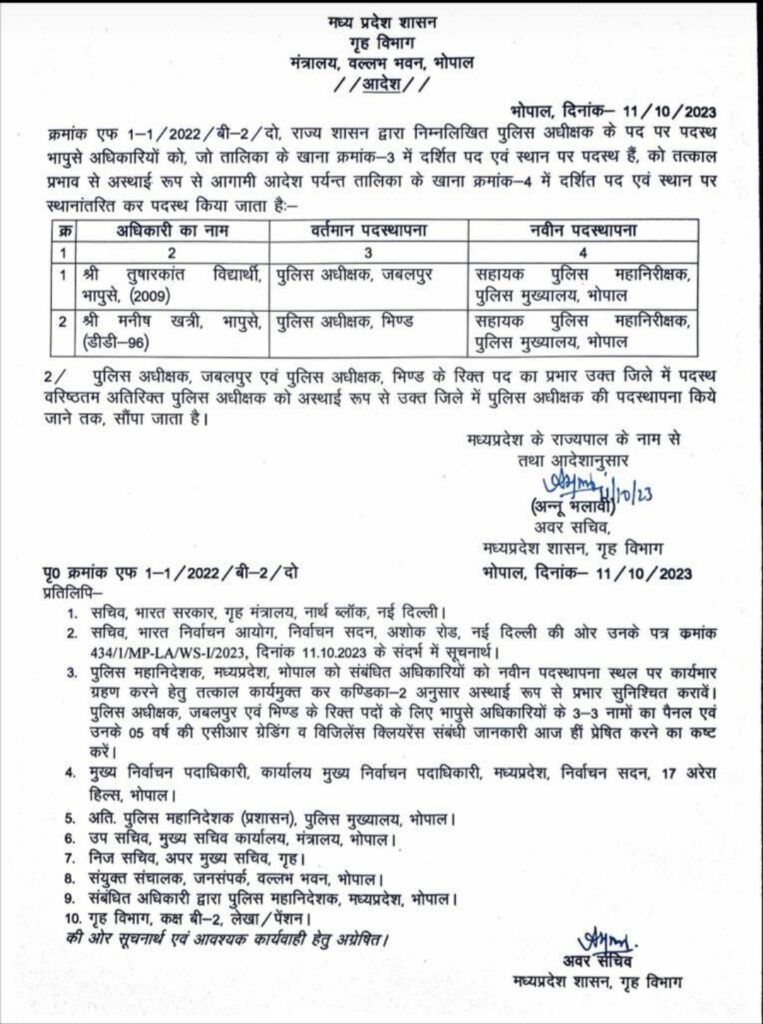 इन्हीं के साथ ही जबलपुर और भिण्ड जिले के पुलिस अधीक्षक भी हटाएं गए।