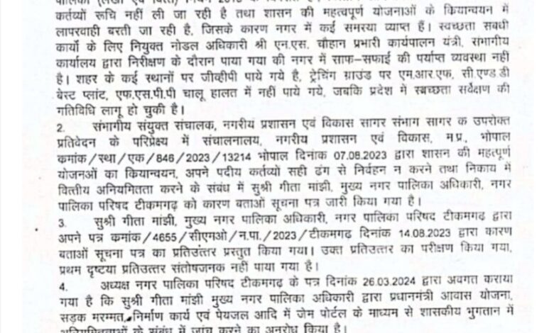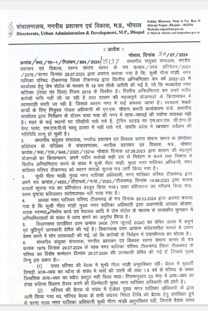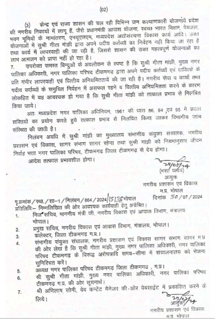 नगर पालिका की विवादित सीएमओ हुई निलंबित, नगरीय प्रशासन आयुक्त भरत यादव ने की कार्यवाही