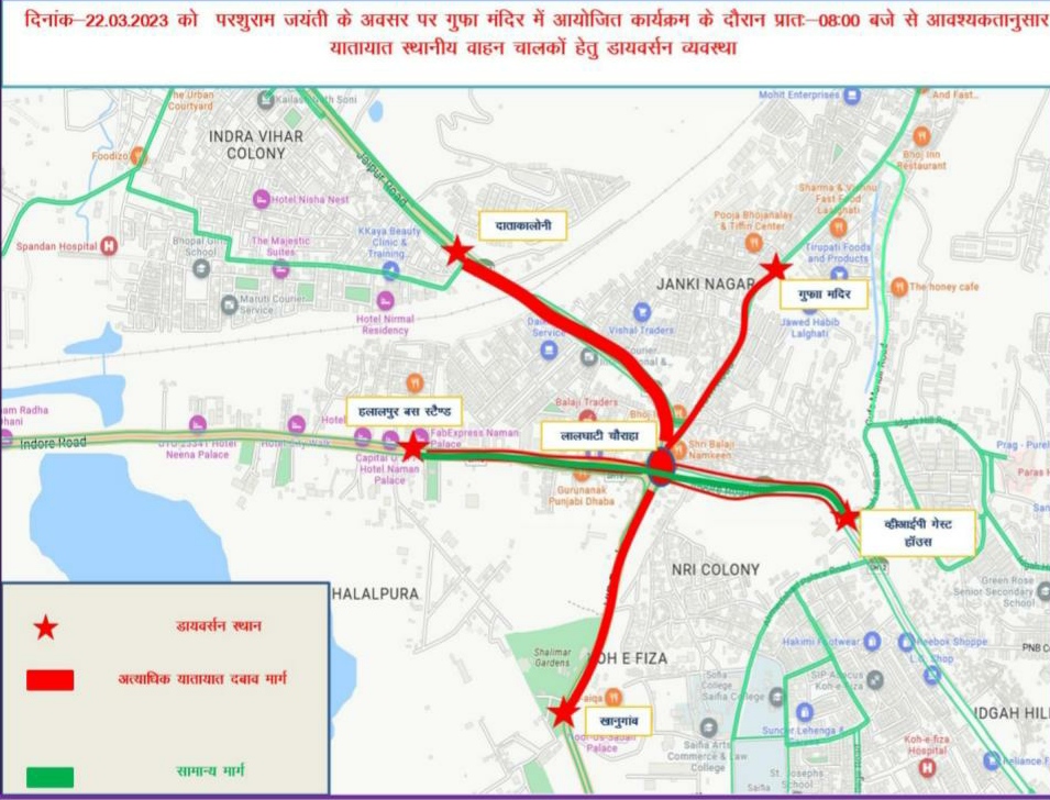दिनांक-22.04.2023 को परशुराम जयंती के अवसर पर गुफा मंदिर में आयोजित कार्यक्रम के दौरान प्रातः-08ः00 बजे से आवश्यकतानुसार यातायात डार्यवसन व्यवस्था निम्नानुसार रहेगीः-
