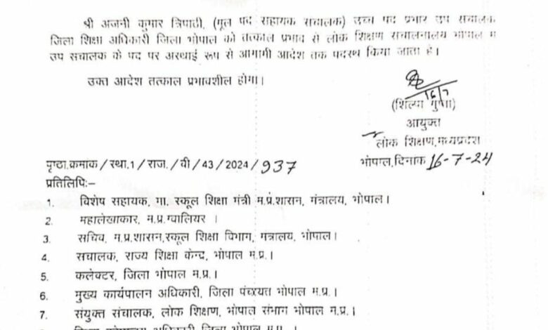जिला शिक्षा अधिकारी(DEO) अंजनी कुमार त्रिपाठी को हटाया