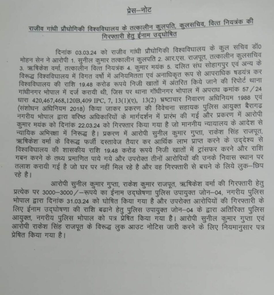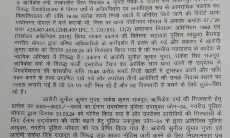 प्रकरण में आरोपी सुनील कुमार गुप्ता, राकेश सिंह राजपूत, ऋषिकेश वर्मा के विरूद्ध फर्जी दस्तावेज तैयार कर आर्थिक लाभ प्राप्त करने के उद्देश्य से विश्वविघालय की शासकीय राशि 19.48 करोड रूपये निजी खातों में ट्रांसफर करने और राशि गबन करने के तथ्य प्रमाणित पाये गये और उपरोक्त तीनों आरोपियों की उनके निवास स्थान पर तलाश करायी गई है जो घर पर नहीं मिल रहे है और वह गिरफ्तारी से बचने के लिये लुक-छिप रहे है। आरोपी सुनील कुमार गुप्ता, राकेश कुमार राजपूत, ऋषिकेश वर्मा की गिरफ्तारी हेतु प्रत्येक पर 3000-3000/-रूपये का ईनाम उद्घोषणा पुलिस उपायुक्त जोन-04, नगरीय पुलिस भोपाल द्वारा दिनांक 31.03.24 को घोषित किया गया है और उपरोक्त आरोपियों की गिरफ्तारी के लिए ईनाम उद्घोषणा की राशि बढाने हेतु पुलिस उपायुक्त जोन-04 के द्वारा अतिरिक्त पुलिस आयुक्त, नगरीय पुलिस भोपाल को पत्र प्रेषित किया गया है। आरोपी सुनील कुमार गुप्ता एवं आरोपी राकेश सिंह राजपूत के विरूद्ध लुक आउट नोटिस जारी करने के लिए नियमानुसार पत्र प्रेषित किया गया है।