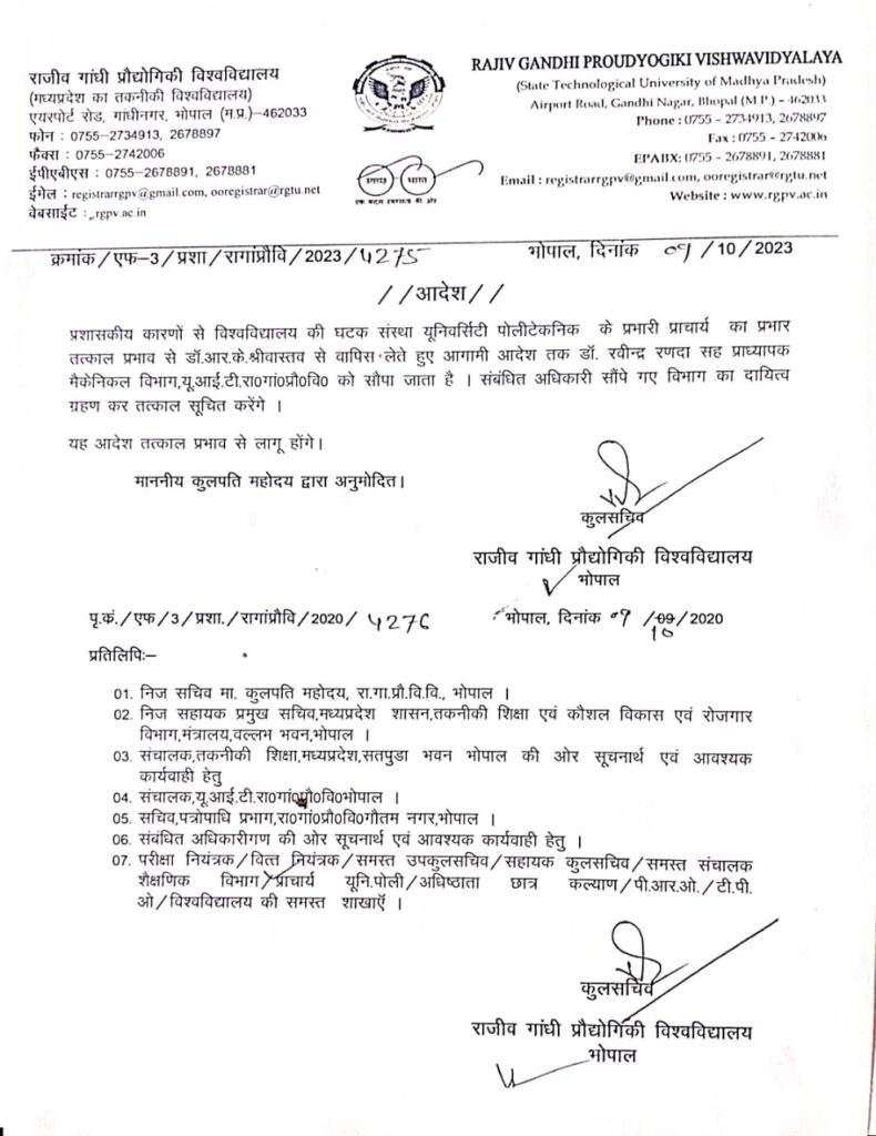 ब्रेकिंग न्यूज़ राजीव गांधी प्रौद्योगिकी विश्वविद्यालय के पॉलिटेक्निक विभाग के नए प्रिंसिपल होंगे डॉ रविंद्र राणादा , आरके श्रीवास्तव पर गिरि गाज पेपर लीक मामले को लेकर