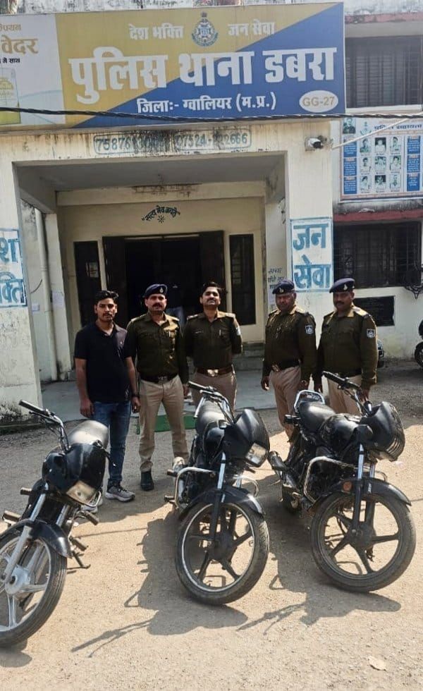 जिले में वाहन चोरी के विरुद्ध कार्रवाई करते हुए थाना डबरा सिटी पुलिस टीम ने एक शातिर वाहन चोर को गिरफ्तार कर उसके कब्जे से चोरी की 03 मोटरसाइकिलें बरामद कीं। इसके अतिरिक्त पूर्व कार्रवाई में भी एक आरोपी को गिरफ्तार कर उसके कब्जे से 02 मोटरसाइकिलें जप्त की गई थीं। इस प्रकार डबरा सिटी पुलिस द्वारा कुल 05 मोटरसाइकिलें बरामद की गईं।