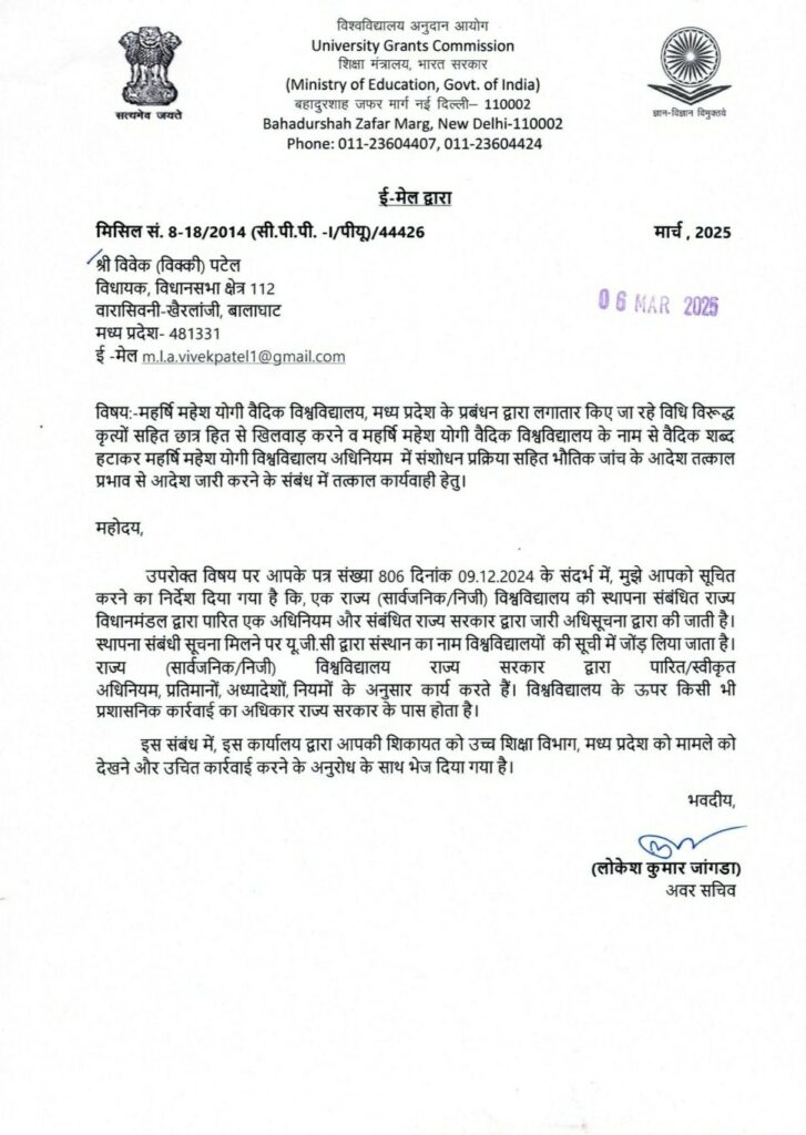 विश्वविद्यालय अनुदान आयोग भारत सरकार के द्वारा  महर्षि महेश योगी वैदिक विश्वविद्यालय को पत्र लिखकर विश्वविद्यालय में हो रहे भ्रष्टाचार