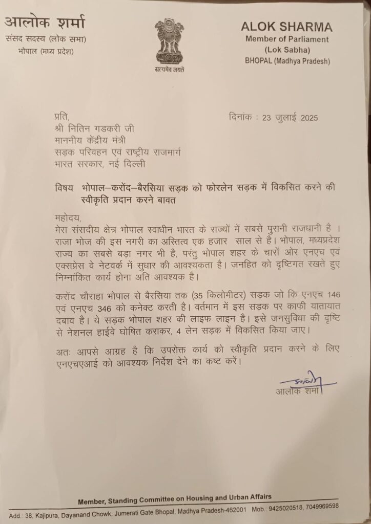 भोपाल सांसद आलोक शर्मा ने देश के केंद्रीय सड़क, परिवहन एवं राजमार्ग मंत्री नितिन गडकरी से भेंट कर भोपाल के करोंद चौराहा से बैरसिया तक 38 किमी लंबे मार्ग में आने वाले 350 गांव लाभान्वित करने हेतु फोरलेन मार्ग करने की मांग की।