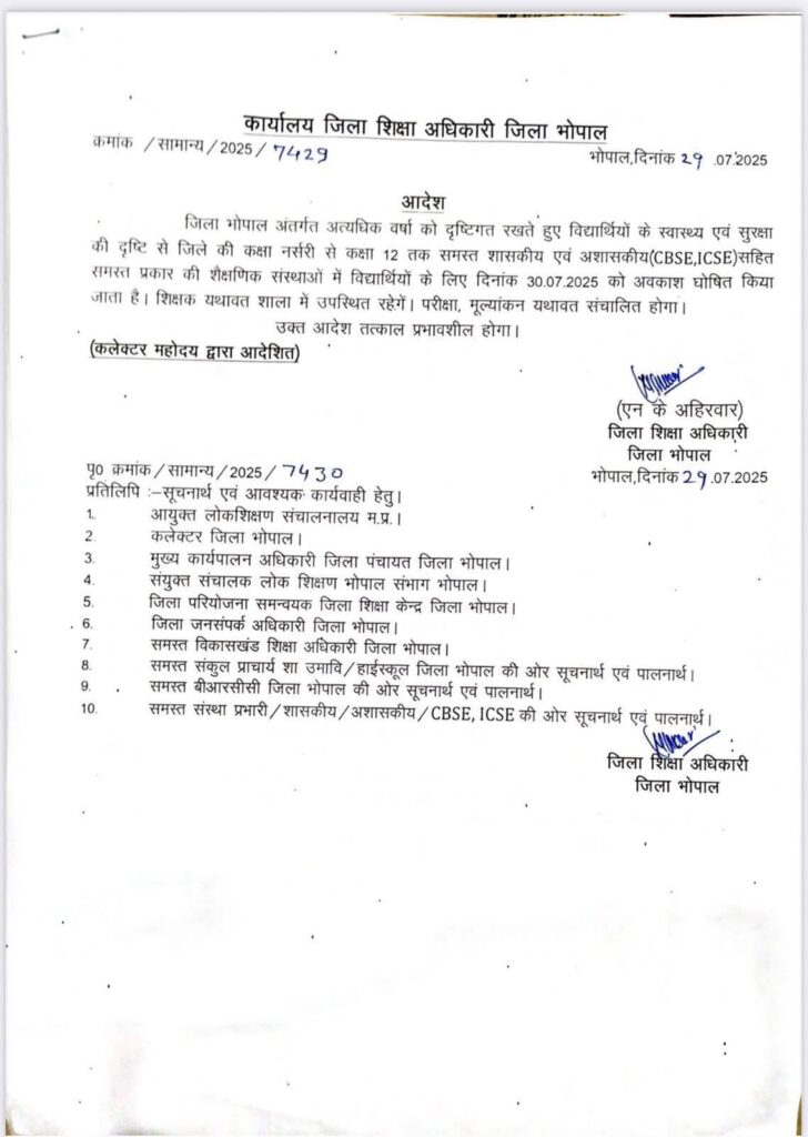 भोपाल में बुधवार को स्कूलों की छुट्टी, बारिश के चलते आदेश जारी