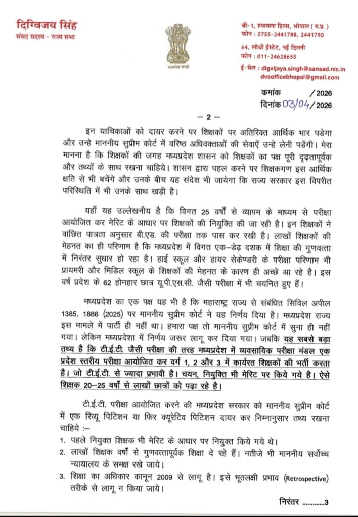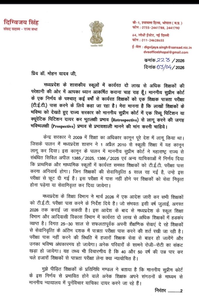 मध्यप्रदेश के लाखों शिक्षकों के हित में टी.ई.टी. अनिवार्यता पर पुनर्विचार की मांग, पूर्व सीएम दिग्विजय सिंह जी ने मुख्यमंत्री डॉ. मोहन यादव जी को लिखा पत्र