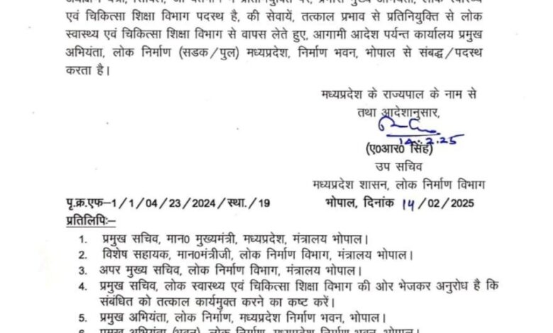 पी.सी.वर्मा, मूलतः अधीक्षण यंत्री, सिविल, जो वर्तमान में प्रतिनियुक्ति पर, प्रभारी मुख्य अभियंता, लोक स्वास्थ्य एवं चिकित्सा शिक्षा विभाग पदस्थ हैँ, इनकी सेवायें प्रतिनियुक्ति से लोक स्वास्थ्य एवं चिकित्सा शिक्षा विभाग से वापस लेते हुए, कार्यालय प्रमुख अभियंता, लोक निर्माण (सडक/पुल) मध्यप्रदेश, निर्माण भवन, पदस्थ करने के आदेश जारी