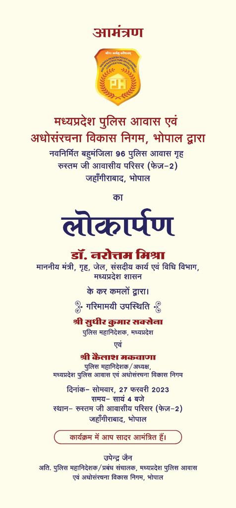 वही हम आपको बता दें कि मध्य प्रदेश पुलिस आवास एवं अधोसंरचना विकास निगम भोपाल द्वारा नवनिर्मित बहुमंजिला 96 ,पुलिस आवास गृह रूस्तमजी आवासीय परिसर फेस टू जहांगीराबाद भोपाल का लोकार्पण मध्य प्रदेश के गृह मंत्री नरोत्तम मिश्रा के द्वारा दिनांक 27 फरवरी 2023 समय 4:00 बजे किया जाएगा।