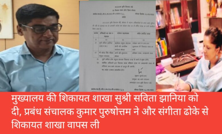 मुख्यालय की शिकायत शाखा सुश्री सविता झानिया को दी, प्रबंध संचालक कुमार पुरुषोत्तम ने और संगीता ढोके से शिकायत शाखा वापस ली