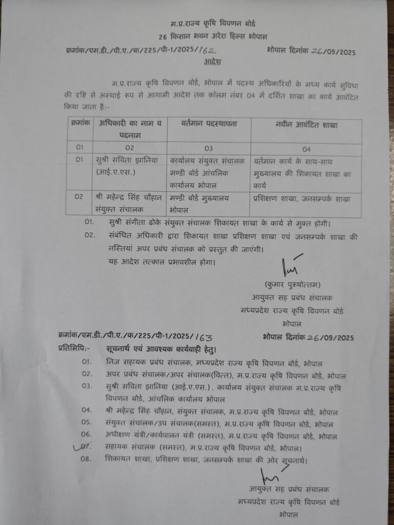मध्य प्रदेश राज्य कृषि विपणन बोर्ड में फिर हुआ उलट फिर आयुक्त सह प्रबंधक संचालक कुमार पुरुषोत्तम ने सुश्री सविता झानिया को वर्तमान कार्य के साथ मुख्यालय की शिकायत शाखा कार्य भी दिया.