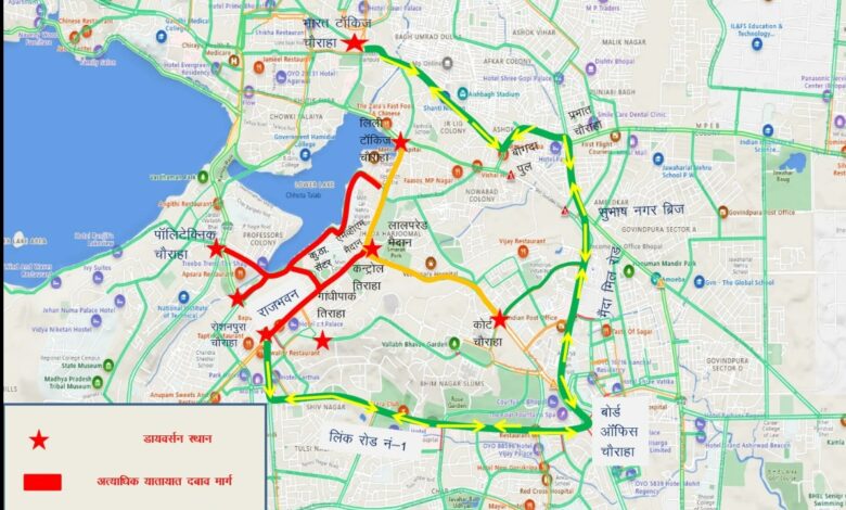 2. सामान्य दो पहिया, चार पहिया एवं लोकपरिवहन वाहन – रोशनपुरा चैराहे से पुराना पुलिस कंट्रोल रूम तिराहा, पाॅलिटेक्निक चौराहा से राजभवन, बाणगंगा से राजभवन, एमएलए रेस्ट हाउस से राजभवन, एवं मछलीघर तिराहा से गांधी पार्क तिराहा तक पूर्णतः प्रतिबंधित रहेगा ।