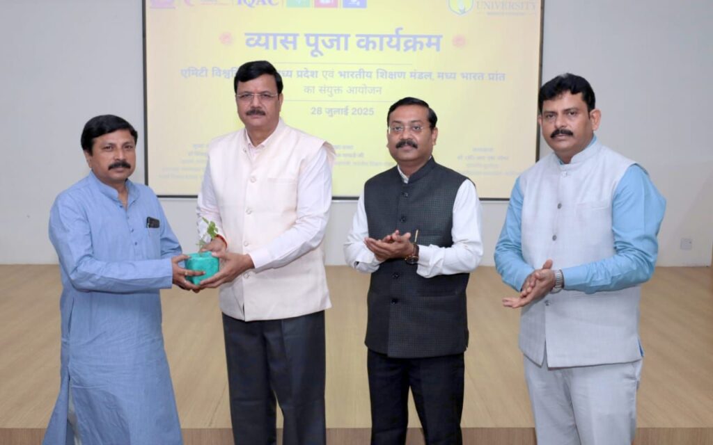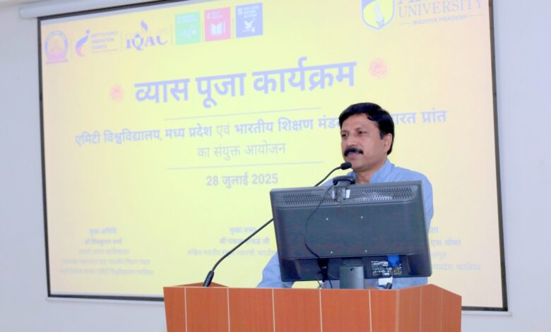 ग्वालियर। भारत की शिक्षा व्यवस्था में जब तक शिक्षक गुरु के रूप में प्रतिष्ठित नहीं होगा और छात्र अपने गुरु का सम्मान नहीं करेंगे, तब तक वे पूर्ण ज्ञान प्राप्त नहीं कर पाएंगे। विद्यार्थियों के जीवन में सफलता की राह में बाधाएँ आएंगी। गुरु का सम्मान करने पर ही उन्हें आत्मिक, व्यावहारिक, सांसारिक एवं आध्यात्मिक सुख प्राप्त हो सकता है। यह बात भारतीय शिक्षण मंडल के अखिल भारतीय संयुक्त महामंत्री पंकज नाफड़े ने कही। वे अमीटी विश्वविद्यालय एवं भारतीय शिक्षण मंडल के संयुक्त तत्वावधान में आयोजित व्यास पूजा कार्यक्रम को विशिष्ट अतिथि के रूप में संबोधित कर रहे थे।