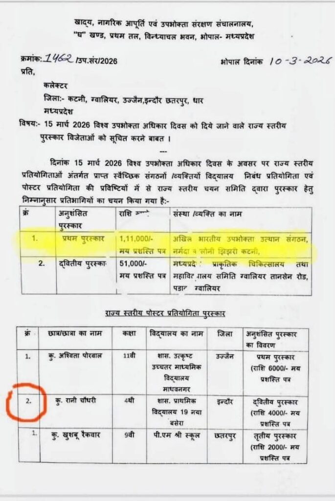 मध्य प्रदेश शासन द्वारा राज्य स्तरीय उपभोक्ता संरक्षण पुरस्कार से अखिल भारतीय उपभोक्ता उत्थान संगठन को सम्मानित किया गया