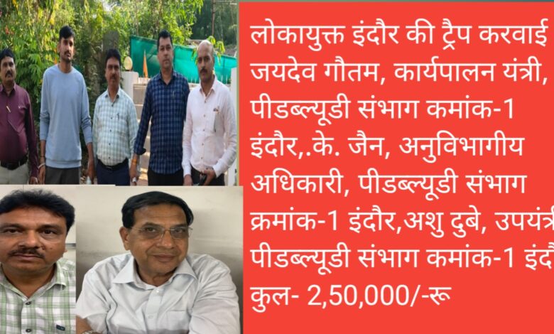लोकायुक्त इंदौर की ट्रैप करवाई जयदेव गौतम, कार्यपालन यंत्री, पीडब्ल्यूडी संभाग कमांक-1 इंदौर,.के. जैन, अनुविभागीय अधिकारी, पीडब्ल्यूडी संभाग क्रमांक-1 इंदौर,अशु दुबे, उपयंत्री, पीडब्ल्यूडी संभाग कमांक-1 इंदौर, कुल- 2,50,000/-रू
