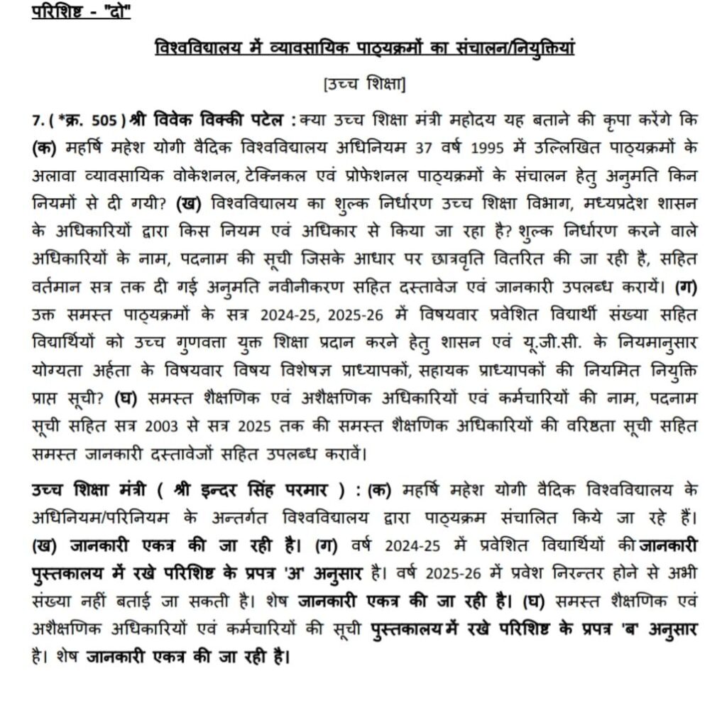 विधायक विवेक पटेल के प्रश्न क्रमांक 505 के उत्तर में महर्षि महेश योगी वैदिक विश्वविद्यालय प्रबंधन के नियम विरुद्ध कृत्य सहित छात्रहित से खिलवाड़ उजागर