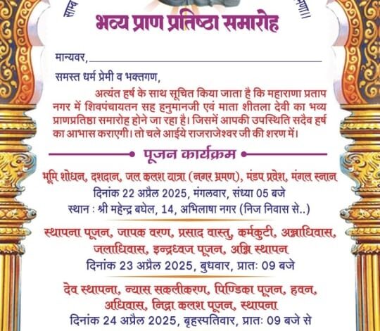 शिव पंचायतन सह हनुमान जी एवं माता शीतला देवी का भव्य प्राण प्रतिष्ठा समारोह होने जा रहा,राजपूत समाज के महाराणा प्रताप नगर बचपन स्कूल के सामने