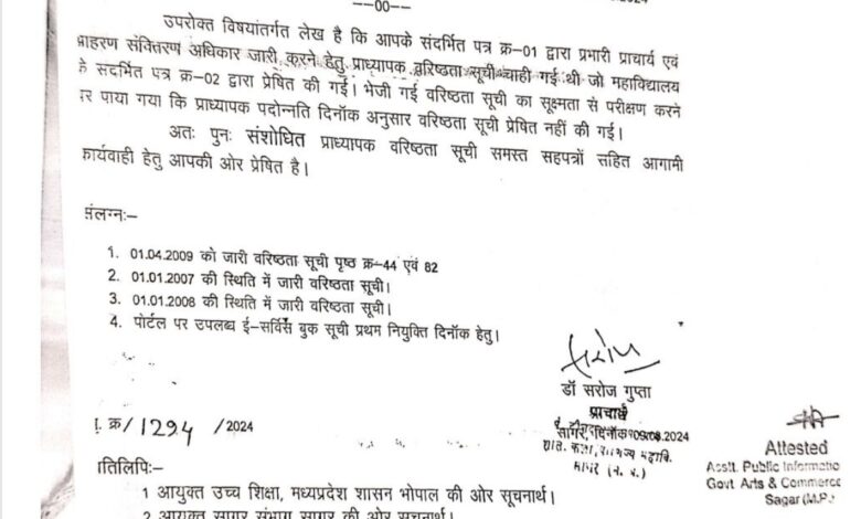सागर। संभागीय मुख्यालय के अग्रणी कॉलेज शासकीय कला एवं वाणिज्य महाविद्यालय में पदस्थ हिंदी विभाग की प्रोफेसर डॉ सरोज गुप्ता ने प्राचार्य बनने के लिए दस्तावेजों में हेर फेर कर वरिष्ठता सूची को ही बदल दिया और उच्च शिक्षा विभाग की आंखों में धूल झोंक कर प्राचार्य का पद हासिल कर लिया। इस मामले की शिकायत उच्च स्तर पर की गई है।