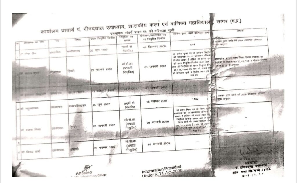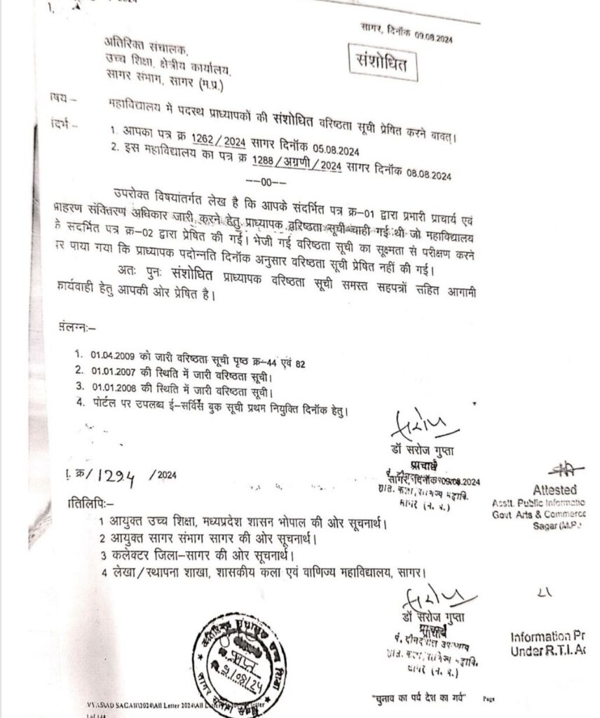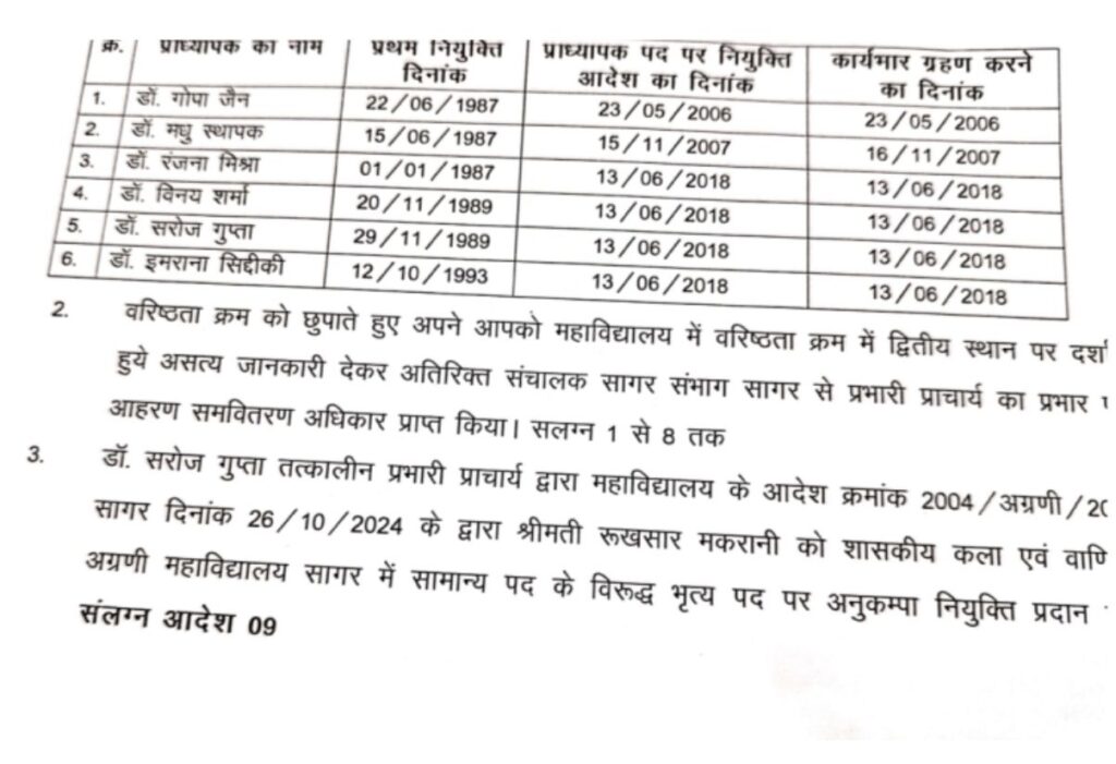 सागर मे प्रोफेसर डॉ सरोज गुप्ता ने प्राचार्य बनने के लिए दस्तावेजों में हेर फेर कर वरिष्ठता सूची को ही बदल दिया और उच्च शिक्षा विभाग की आंखों में धूल झोंक कर प्राचार्य का पद हासिल कर लिया।