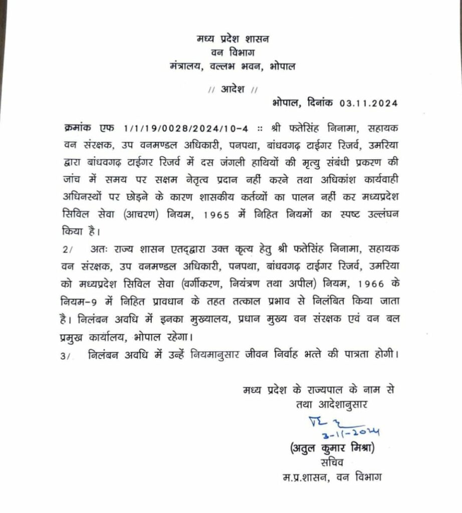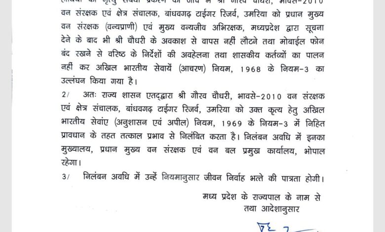 जिसके बाद गौरव चौधरी को निलंबित कर दिया है वही हम आपको यह भी बता दें कि फतेह सिंह निमामा को भी तत्काल प्रभाव से निलंबित कर दिया गया है मध्य प्रदेश शासन वन विभाग के सचिव अतुल कुमार मिश्रा के द्वारा निलंबन अवधि में मुख्यालय प्रधान मुख्य वन संरक्षण एवं वन बाल प्रमुख कार्यालय भोपाल रहेगा आदेश जारी
