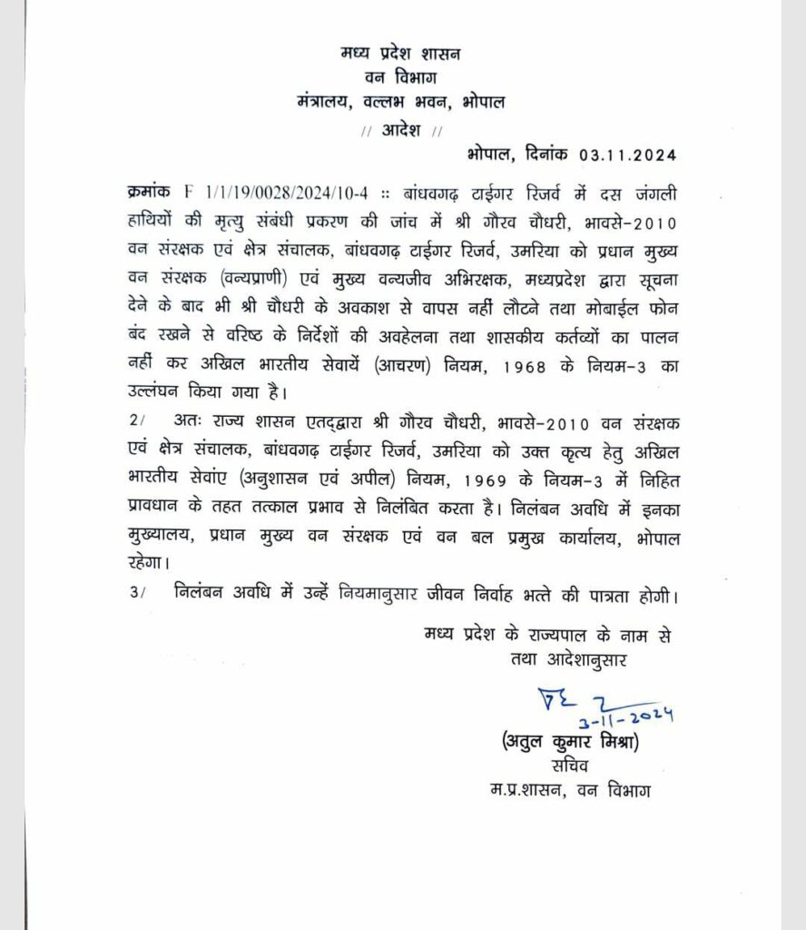 बांधवगढ़ टाइगर रिजर्व में 10 जंगली हाथियों की मृत्यु संबंधी प्रकरण की जांच में गौरव चौधरी वन संरक्षक एवं क्षेत्र संचालक बांधवगढ़ टाइगर रिजर्व उमरिया को प्रधान मुख्य वन संरक्षक एवं मुख्य वन्य जीव अभी रक्षा मध्यप्रदेश द्वारा सूचना देने के बाद भी चौधरी के अवकाश से वापस नहीं लौट तथा मोबाइल फोन बंद रखने से वरिष्ठ के निर्देशों की अवहेलनाता तथा शासकीय कर्तव्यों का पालन नहीं कर अखिल भारतीय सेवाएं आचरण नियम 1968 के नियम तीन का उल्लंघन किया है