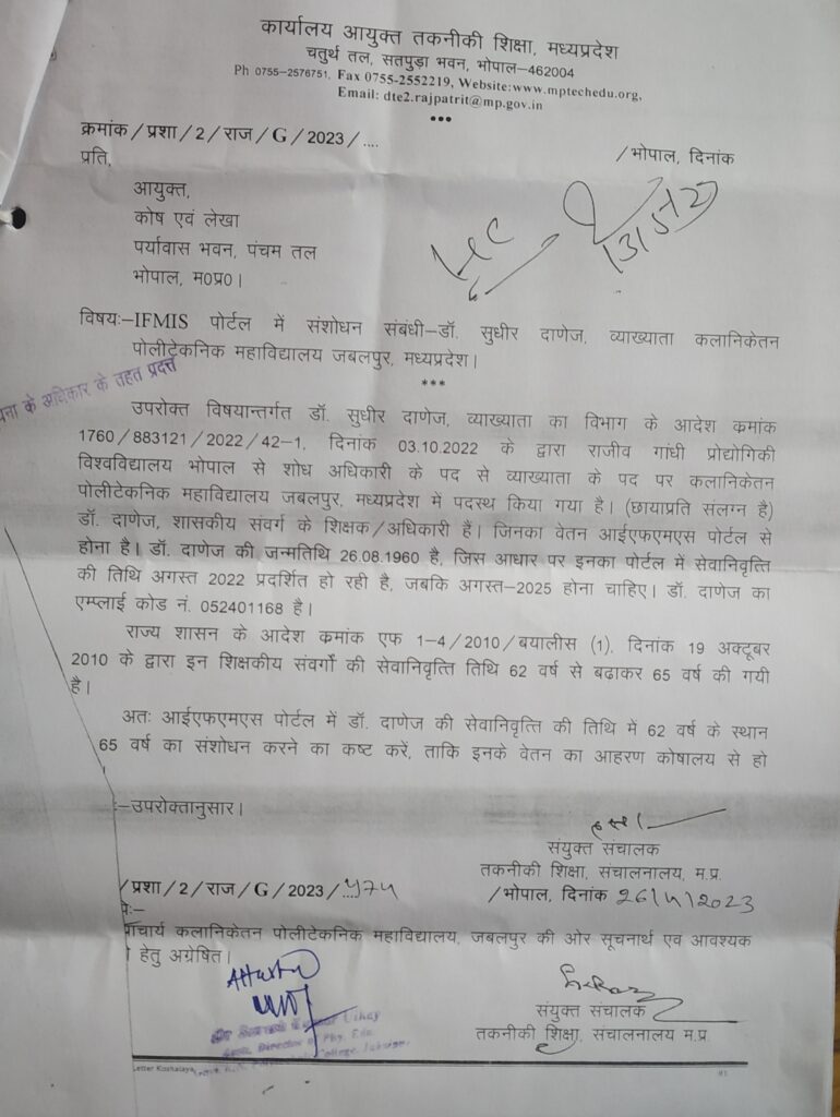 इन्हीं के दोस्त जो वर्तमान में जबलपुर में पदस्थ हैं सुधीर दानेज इनके द्वारा भी आयुक्त कोष एवं लेखा पर्यावास भवन पंचम तल भोपाल को निवेदन किया है इनकी भी अधिवर्षकीय आयु बढ़ाई जाए जिस प्रकार से उदय सुरंगे सचिव राजीव गांधी प्रौद्योगिकी विश्वविद्यालय की बढ़ाई गई है