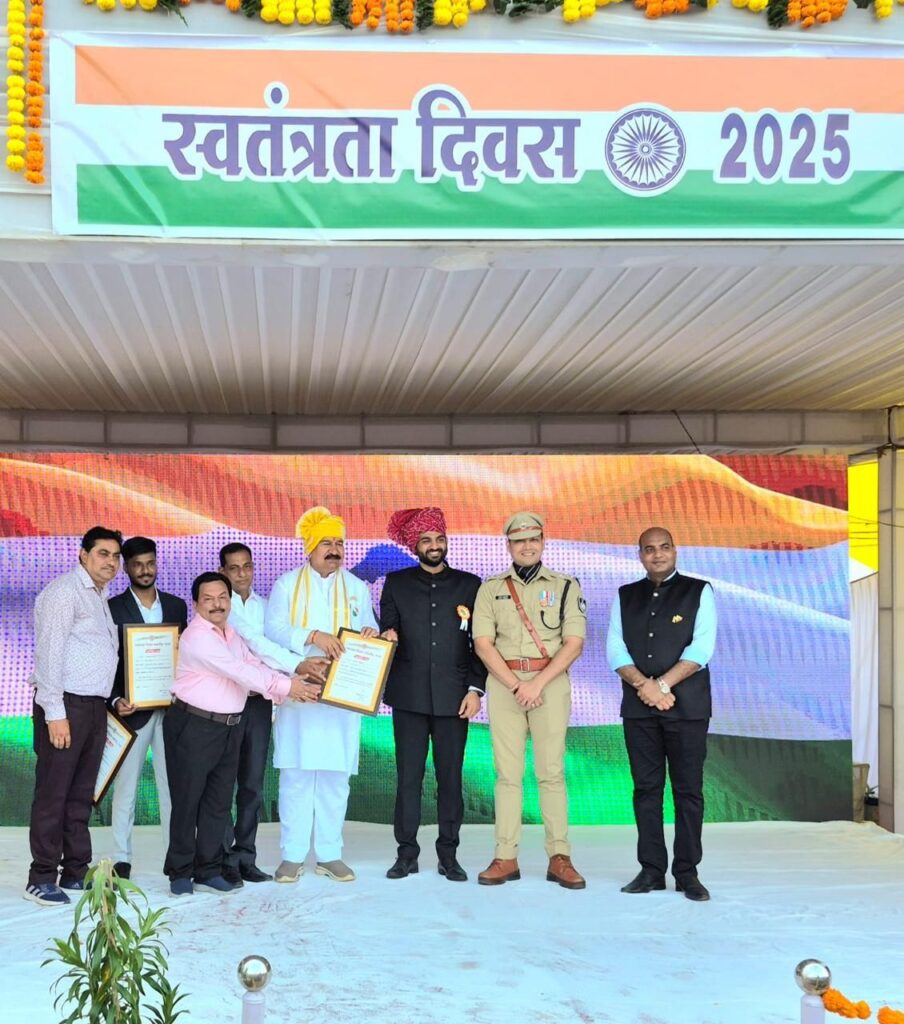 श्री उमेश बसेड़िया शर्मा मंडी सचिव के नेतृत्व में श्री सुनील भसीन, श्री राजेश सिंहल एवं श्री वैभव राठौर को माननीय विधायक श्री दिलीप सिंह परिहार, कलेक्टर श्री हिमांशु चंद्रा, एस पी श्री अंकित जायसवाल एवं एस. डी.एम श्री संजीव साहू द्वारा अपने कर कमलों से स्वतंत्रता दिवस के पर्व पर अधिकारी/कर्मचारी जिला उत्कृष्टा प्रशस्ति पत्र प्रदान किया गया