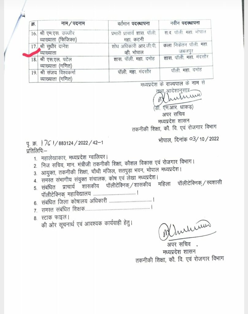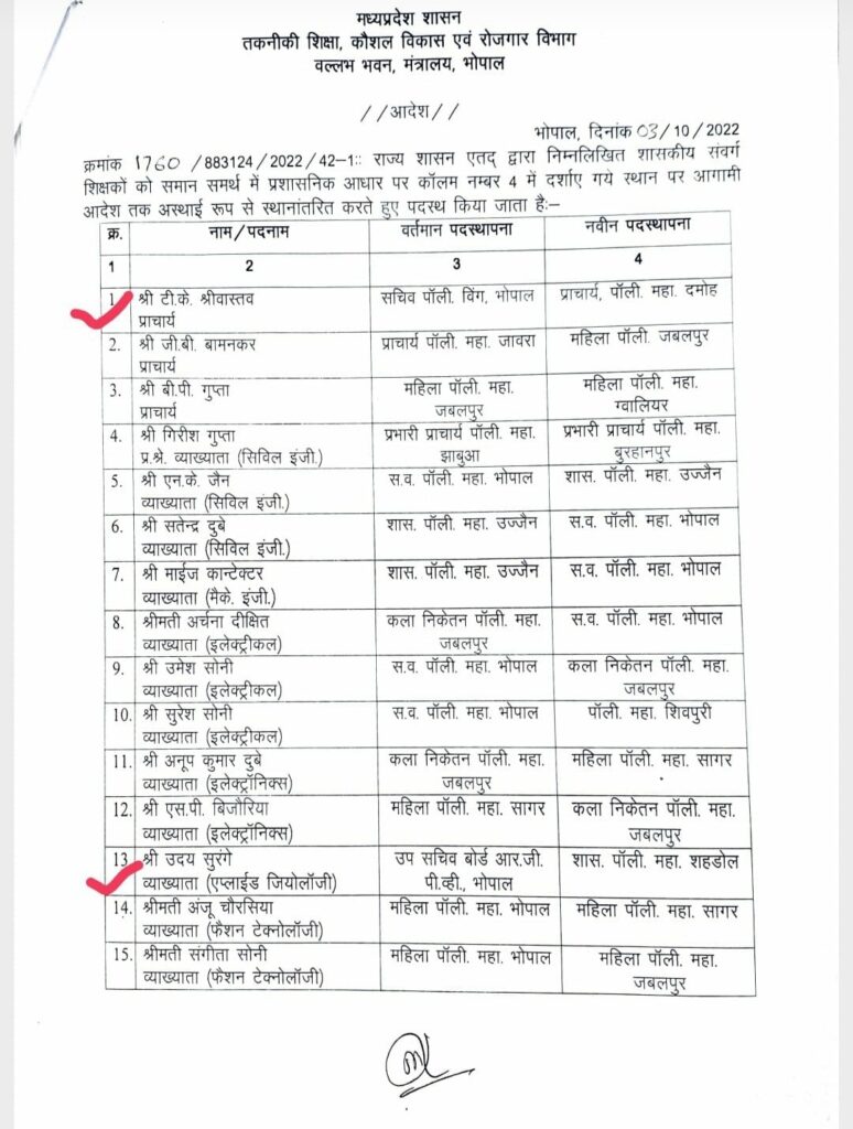 तकनीकी शिक्षा, कौशल विकास एवं रोजगार विभाग द्वारा 03.10.2022 को प्रदेश की तकनीकी संस्थायों के प्रचार्यों, विभागाध्यक्षो, व्याख्यातायों के स्थानांतरण किये थे!