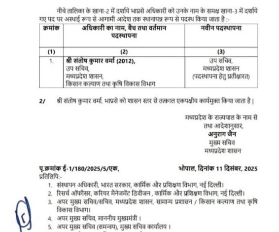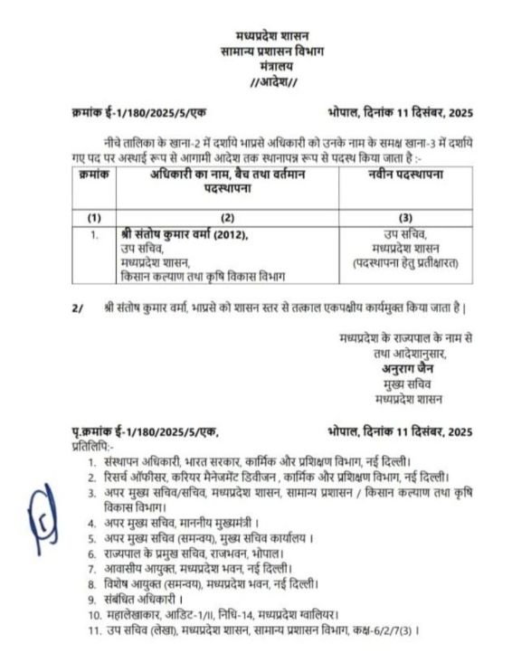 IAS संतोष वर्मा को कृषि विभाग से हटाकर, मंत्रालय में उपसचिव के पद पर पदस्थ किया