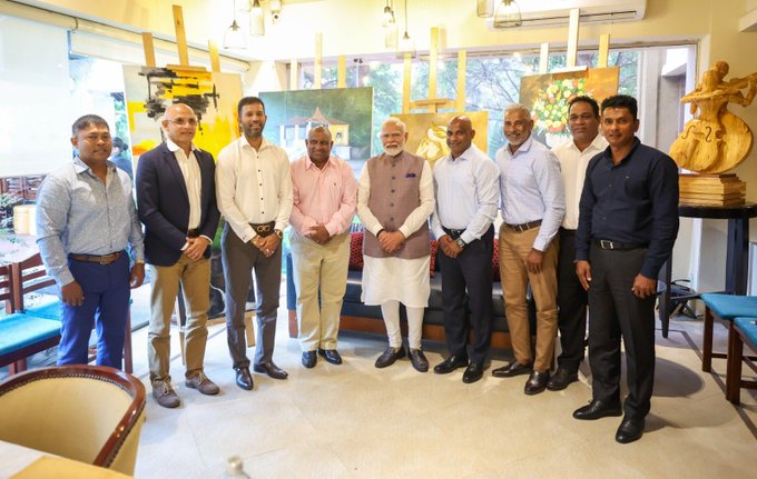 Prime Minister Narendra Modi is currently on a two-day visit to Sri Lanka. On Friday, he received a grand welcome in the country. On Saturday, PM Modi was honored with Sri Lanka’s highest civilian award, the “Sri Lanka Mitra Vibhushan.” During his visit to Colombo, PM Modi also met with members of Sri Lanka’s 1996 Cricket World Cup-winning team. He shared a picture of this special moment on social media.