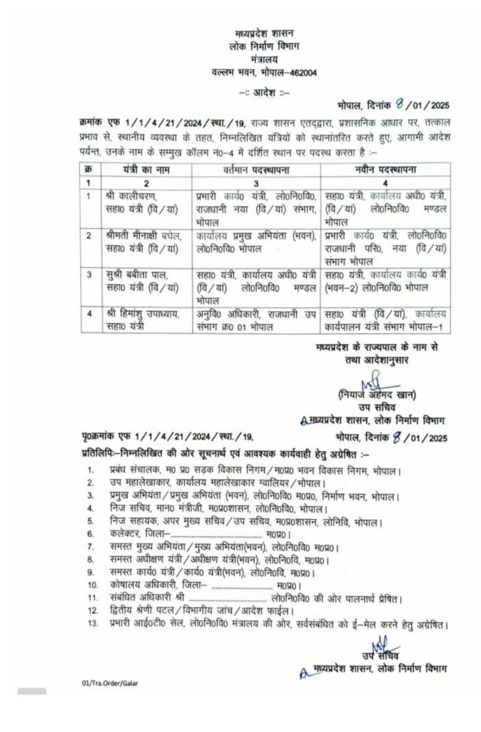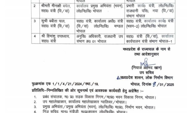 भोपाल में PWD के चार सहायक यात्रियों की नई पदस्थापना आदेश जारी